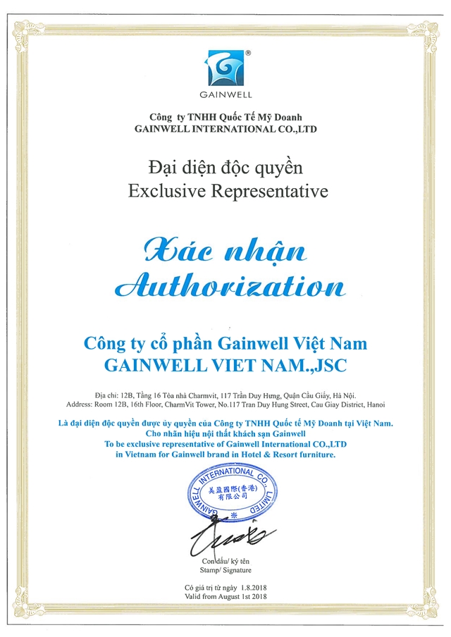 Giấy chứng nhận Công ty Cổ phần Gainwell Việt Nam - đại diện chính thức của Tập đoàn nội thất Mỹ Doanh - GAINWELL FURNITURE GROUP. Chịu trách nhiệm quản lý và điều hành các hoạt động của tập đoàn tại Việt Nam.