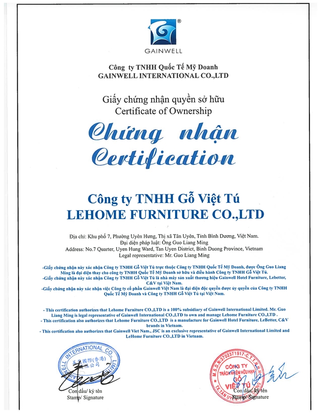 Với tư cách là đại diện chính thức của Tập đoàn Nội thất Mỹ Doanh - Gainwell Furinture Group, Công ty Cổ phần Gainwell Việt Nam sẽ là đơn vị chịu trách nhiệm quản lý vá phát triển các hoạt động kinh doanh của Nhà máy Gainwell Việt Nam - Lehome Furiture nói riêng và hoạt động kinh doanh của tập đoàn tại Việt Nam và khu vực Đông Nam Á nói chung.